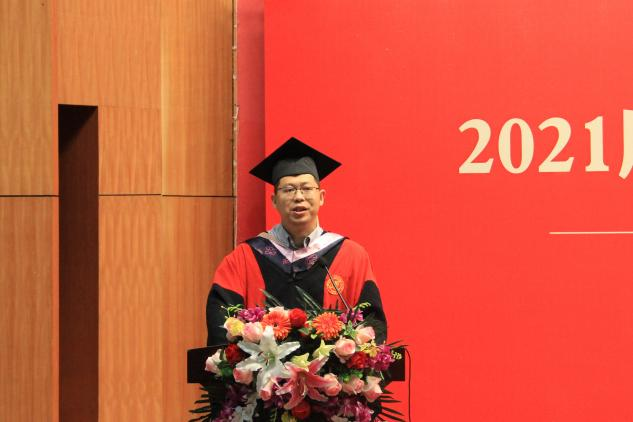 “初心应不改,明日展鸿鹄”。院党委书记冯海清致辞。一句“nba买球正规官方网站永远是你们的家”勾起了毕业生们内心深处美好的回忆。今年既是建党一百周年,也是2021届学生顺利完成学业的一年,冯书记代表学院向同学们传达殷切嘱托,望莘莘学子立足诚信,葆有创新精神,增强自信心;不负使命,勇于担当,立足中华民族伟大复兴战略,将自己的发展同国家发展相结合,成长为国之栋梁;坚持理想,不骄不躁,不忘初心,成就辉煌。同时,他希望同学们传承好“明德弘道,商善天下”的精神,面对今后的生活,葆有“铁塔人”底色。不舍与祝福交织,愿毕业生们都能似鲲鹏般展翅高飞、扶摇而上。