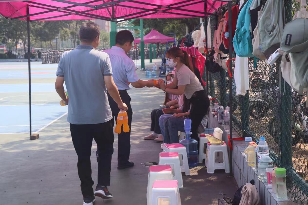 在方队解散休息时,左辞波和李志强为同学们发放饮料,同学们有序上前领取,脸上洋溢着笑容,现场气氛热烈而温馨。