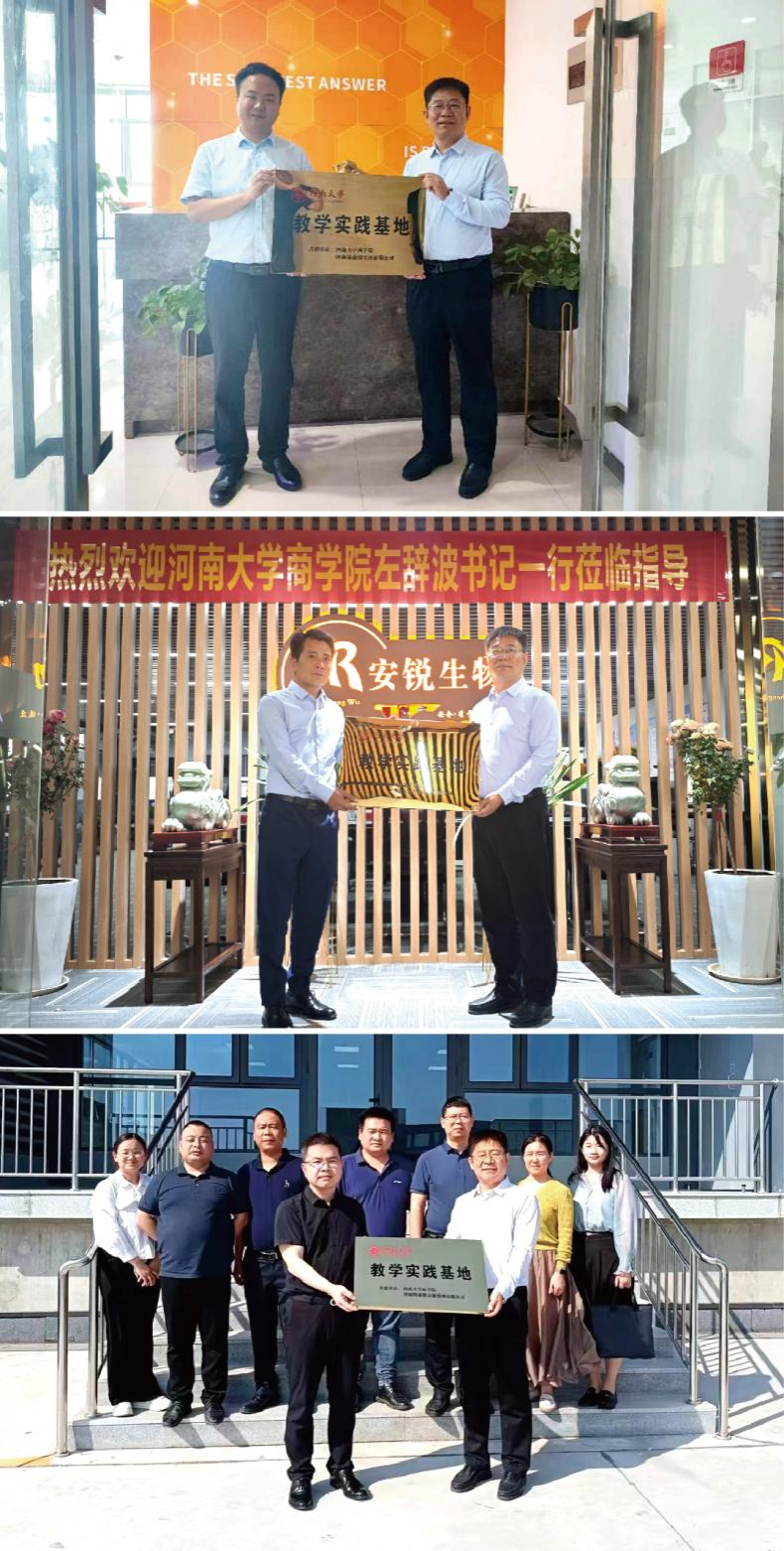为进一步推进产教融合与校企合作,加强大学生校外实践教育基地建设,拓宽nba买球官网毕业生就业渠道,全力促进本科生更充分更高质量的实践、实习与就业,5月10日,学院党委书记左辞波、副院长李耀、电子商务系主任郑佳佳以及学生工作负责人马欢欢、研究生办公室主任党永杰深入河南锦前程实业有限公司、河南钧泰供应链管理有限公司、河南安锐生物科技有限公司举行本科生教育实践基地挂牌仪式,并就毕业生就业、项目合作等方面达成友好意见。