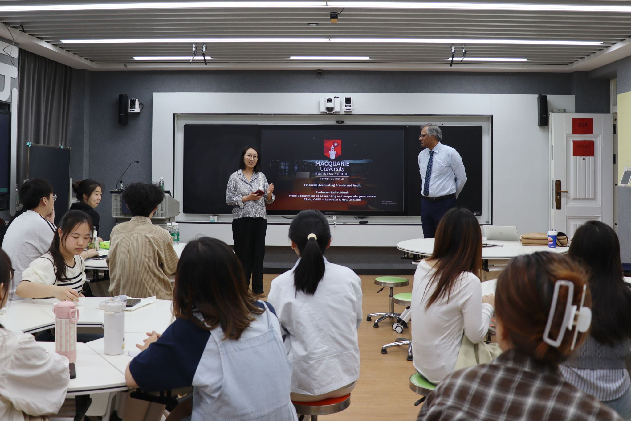 为拓展研究生学术视野,强化学科前沿理论与实践融合,2025年4月14日上午10时,nba买球正规官方网站“国际学术交流周”系列活动第三场在智慧教室举行。澳大利亚麦考瑞大学会计与公司治理系系主任拉哈特·穆尼尔(Rahat Munir)教授以《金融会计欺诈与审计》为主题,为会计学专业学术研究生带来全英示范课。