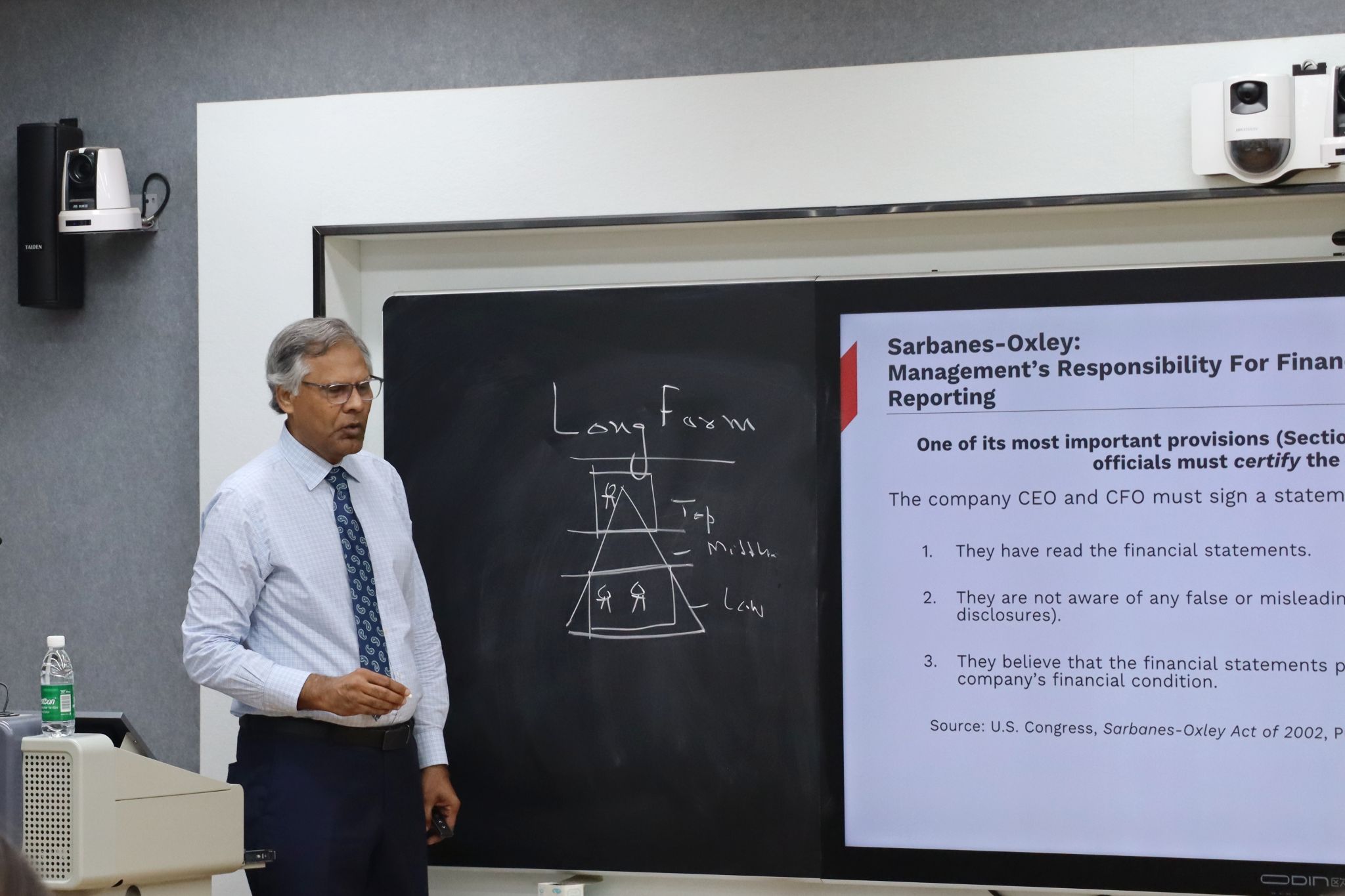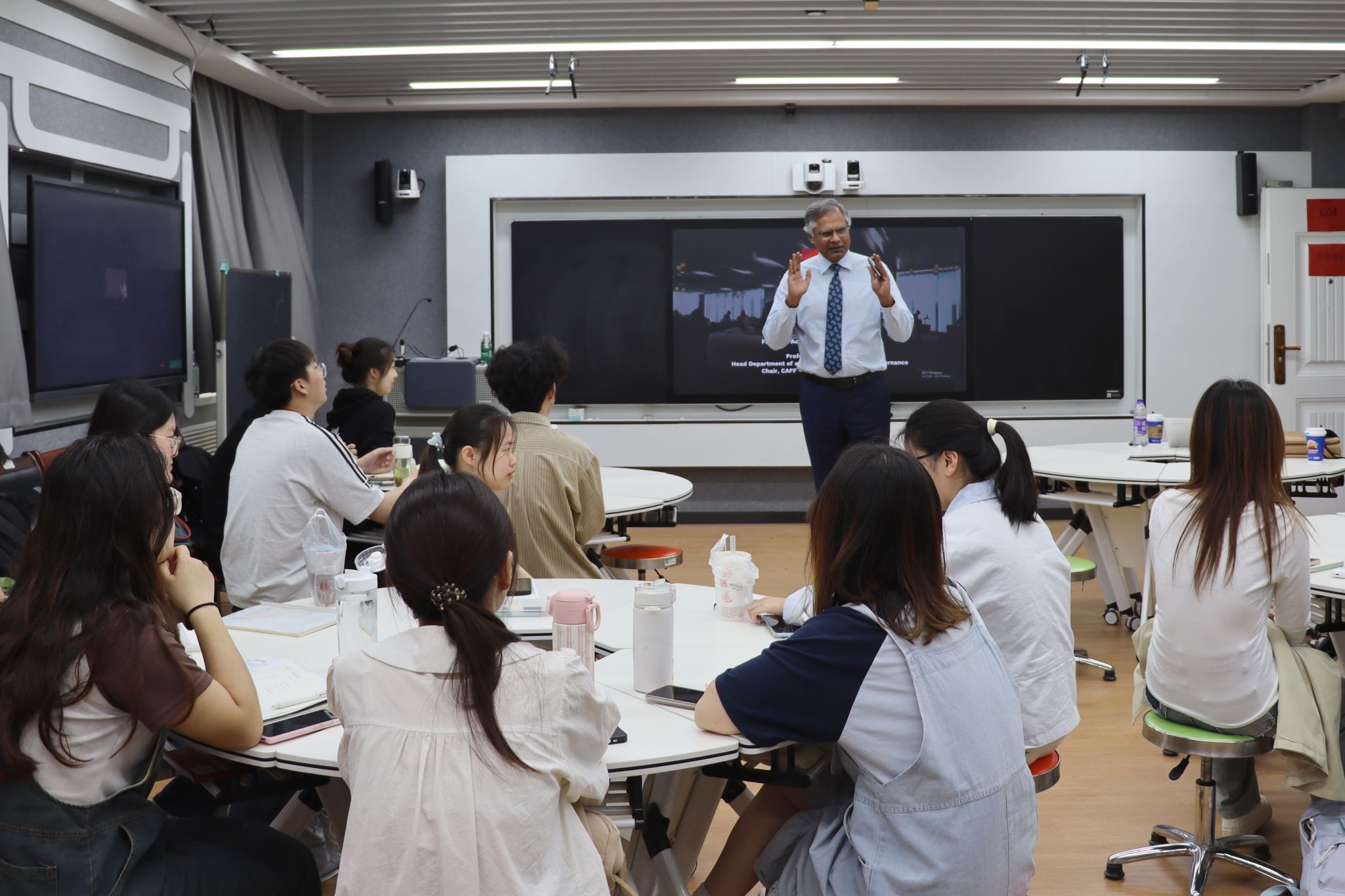 穆尼尔教授聚焦全球金融会计领域的风险防控,通过经典案例拆解与动态模型推演展开教学。课程以国际典型案例为切入点,深入剖析会计欺诈的隐蔽手段、审计技术难点及监管应对策略。他运用“理论框架+实证数据”的双轴教学模式,引导学生探讨人工智能在反欺诈审计中的应用潜力,并模拟跨国企业财报分析的实战场景。研究生们围绕案例中的伦理争议、技术漏洞等议题展开小组辩论,课堂互动频繁,学术思辨氛围浓厚。