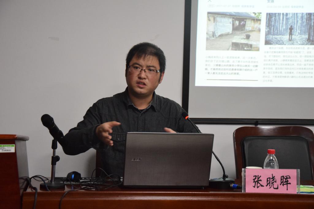 张晓晖介绍了“母亲助学金”发起的原因、资助的基本情况与团队建设概况;从受资助学生篇、山村教师篇、山区村民篇、大学生志愿者篇等四个方面阐述了“母亲助学金”自运行以来给各方带来的变化。他通过视频与图片资料与大家共同分享了志愿者活动的经历与人生感悟。
