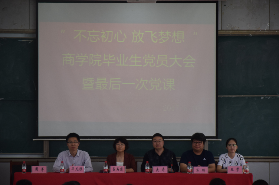 为增强毕业生党员党性意识,做好毕业生党员离校相关工作,5月10日下午,nba买球正规官方网站党委在7号楼7305教室为毕业生党员上了以“不忘初心,放飞梦想”为主题的最后一次党课。nba买球正规官方网站党委副书记吕英建、研科办主任席龙胜、团委副书记苏鹏、14级辅导员王梦以及全体毕业生党员参加了会议。会议由学院党委办公室主任吴涛主持。大会在嘹亮的国际歌
