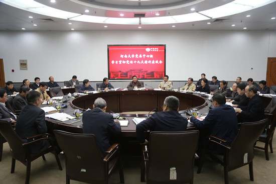 会议现场校党委书记卢克平主持会议并讲话校长宋纯鹏讲话校党委副书记雷霆发言校党委常委、副校长刘先省发言校党委常委、副校长许绍康发言总会计师韩守富发言 11月1日下午,校党委中心组在金明校区行政楼152会议室举行扩大会议,学习研讨党的十九大精神。在校校领导、校两委委员、部分中层干部正职参加了学习。会议由校党委书记卢克平主持。 [详情]