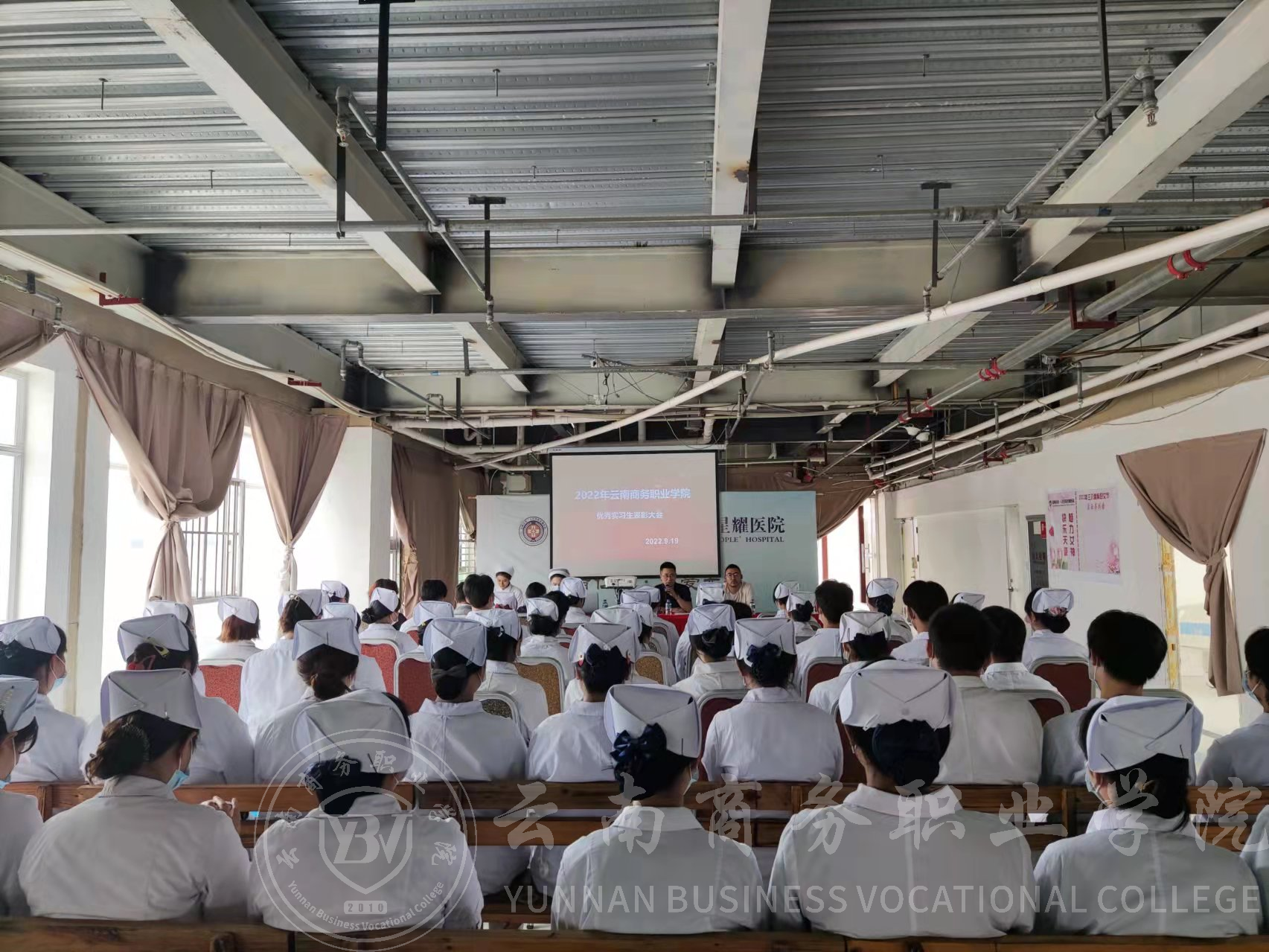9月19日下午,昆明市第一人民医院-星耀医院护理实习生总结暨优秀实习生表彰大会召开,beat365平台官方网站护理学院石宇超副院长、刘晓妍辅导员代表学院应邀参会。