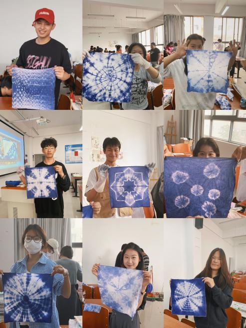孔文君老师详细介绍了扎染的历史渊源、文化内涵以及技艺特点,让学生们对这项古老的染色工艺有了更加深入的了解。随后,传承人现场展示了扎染的制作过程,从扎结、染色到晾干,每一步都充满了艺术性和技巧性,令学生们大开眼界。