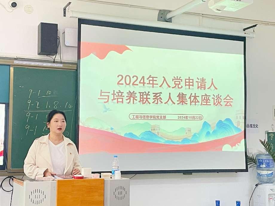 在秋高气爽的季节里,工程与信息学院党支部迎来了一场特别的见面会。2024年10月22日,工程与信息学院党支部组织了一次入党申请人与培养联系人的见面活动,地点设在学院7栋106。此次活动旨在加强党的基层组织建设,促进党员队伍的发展壮大,同时也为有志于加入中国共产党的优秀同志提供了一个展示自我、交流思想的平台。