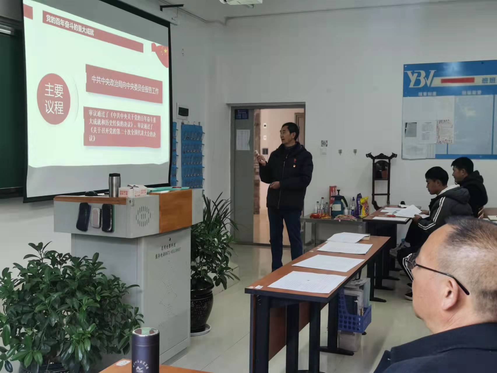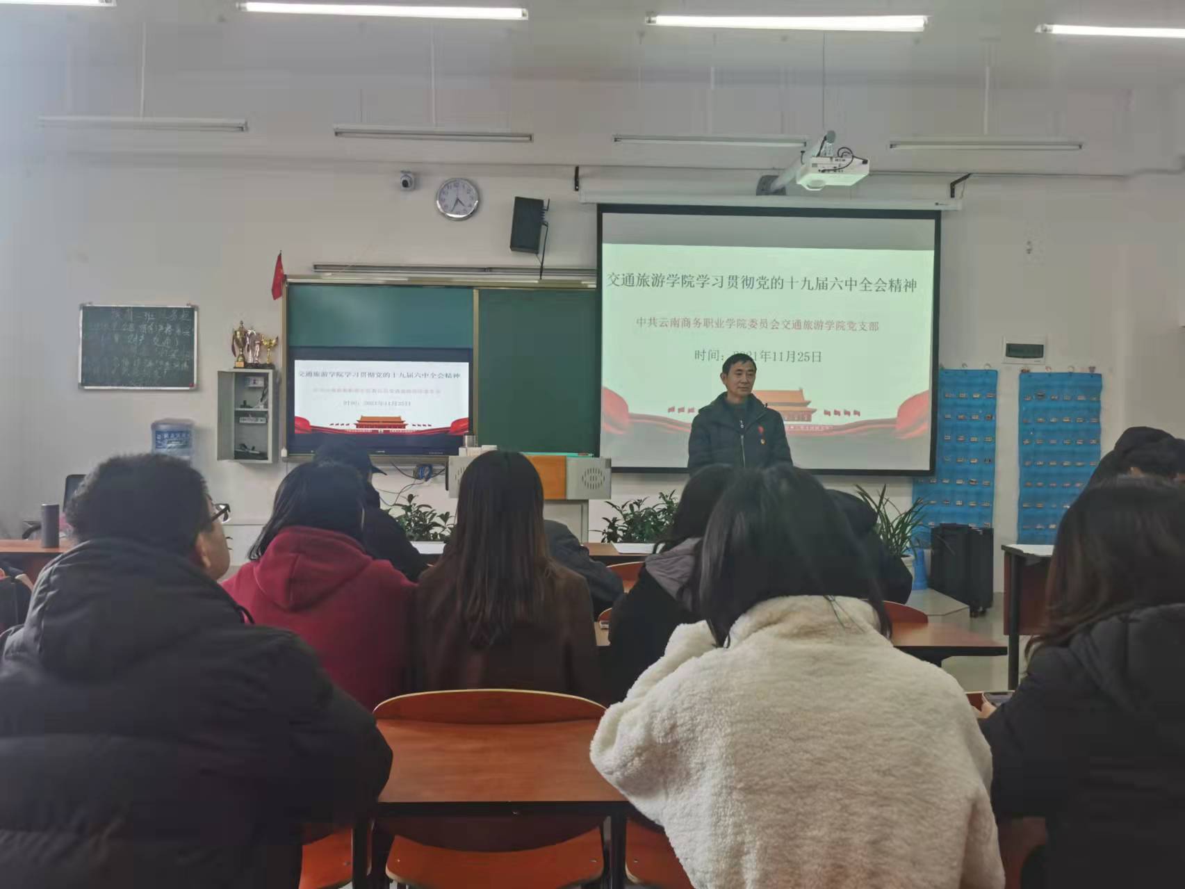 2021年11月25日下午,交通旅游学院全体教职工在交通旅游学院党支部书记毛致远教授的带领下,在三栋104教室进行了党史学习。在学习中通旅游学院党支部书记毛致远教授给全体教职工讲述了共产党的发展,党全心全意为人民服务的宗旨。从根本上改变了中国人民的前途命运、开辟了实现中华民族伟大复兴的正确道路、展示了马克思主义的强大生命力、深刻影响了世界历史进程、锻造了走在时代前列的中国共产党——党的十九届六中全会从五个方面总结概括了党百年奋斗的重大历史意义,为我们深刻理解党百年奋斗的历史逻辑、理论逻辑、实践逻辑,在全面建设社会主义现代化国家新征程上创造新的历史辉煌注入强大思想和行动力量。我们作为高校教育工作者,一定要跟随党的路线,为国家,为社会,为人民培养优秀的社会主义社会的建设者和接班人。