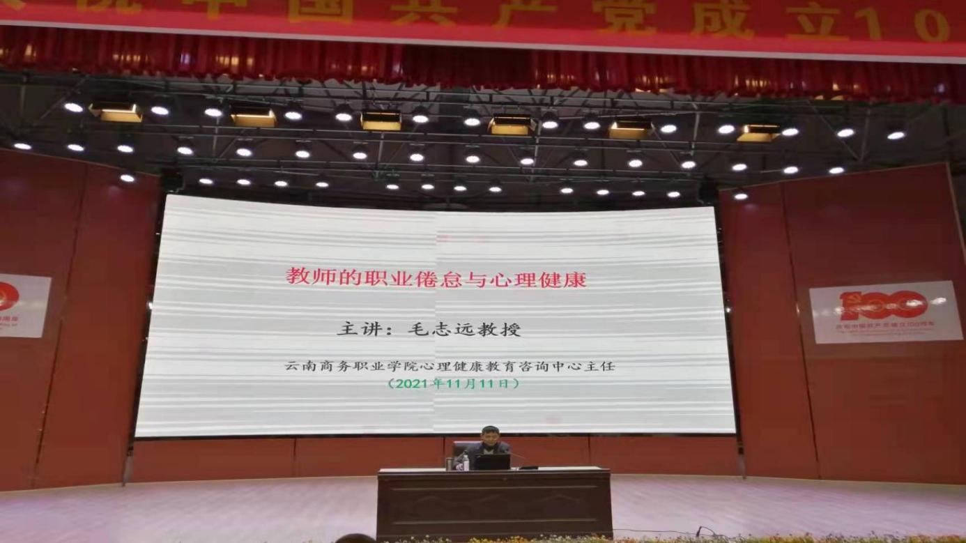 为进一步提高学生工作队伍教师的心理健康水平与教育能力,促进我校学生工作队伍整体向科学化、专业化、规范化发展。2021年11月11日17:00-18:30学生工作部在学生会堂大报告厅特邀我校心理咨询中心主任毛志远教授针对《教师的职业倦怠与心理健康》作专题报告。学生工作部(处)全体成员,校团委全体成员,公寓管理中心全体成员,继续教育学院全体成员,各二级学院执行院长、学生科长、团总支部全体成员,年级组长、全体辅导员、班主任参会。