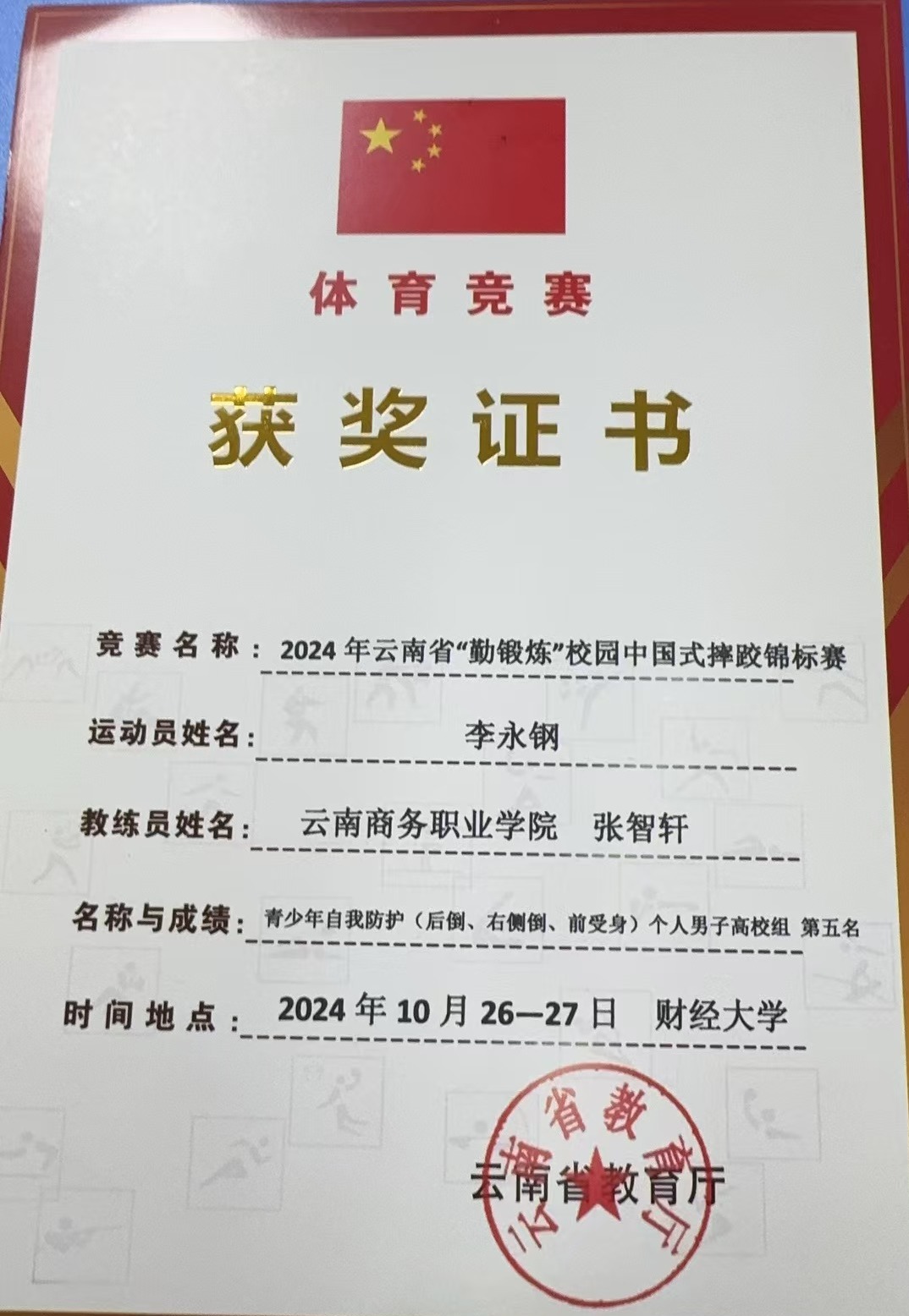 在竞争激烈的男子单人组赛事中,李永钢同学不畏强手,奋力一搏,最终荣获“青少年自我防护(后倒、右侧倒、前受身)个人男子高校组第五名”。