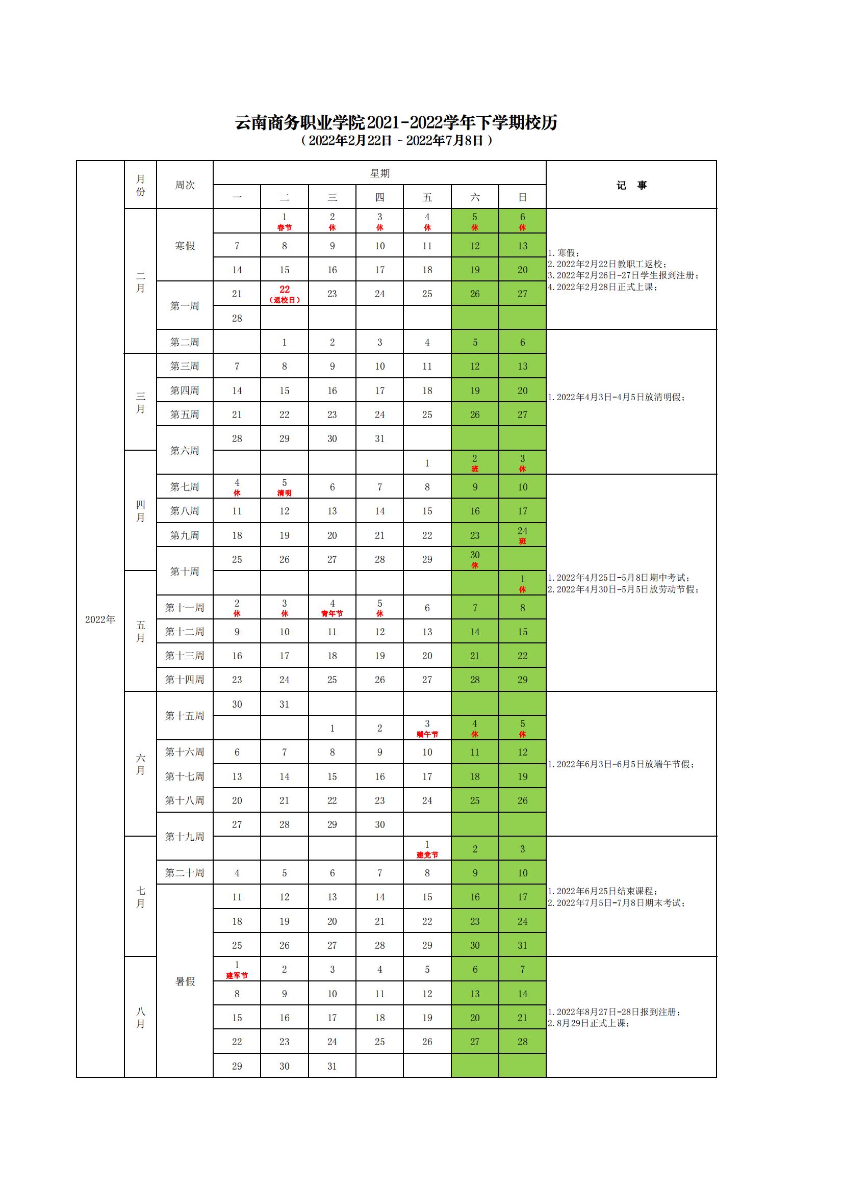 beat365平台官方网站2021-2022学年下学期校历